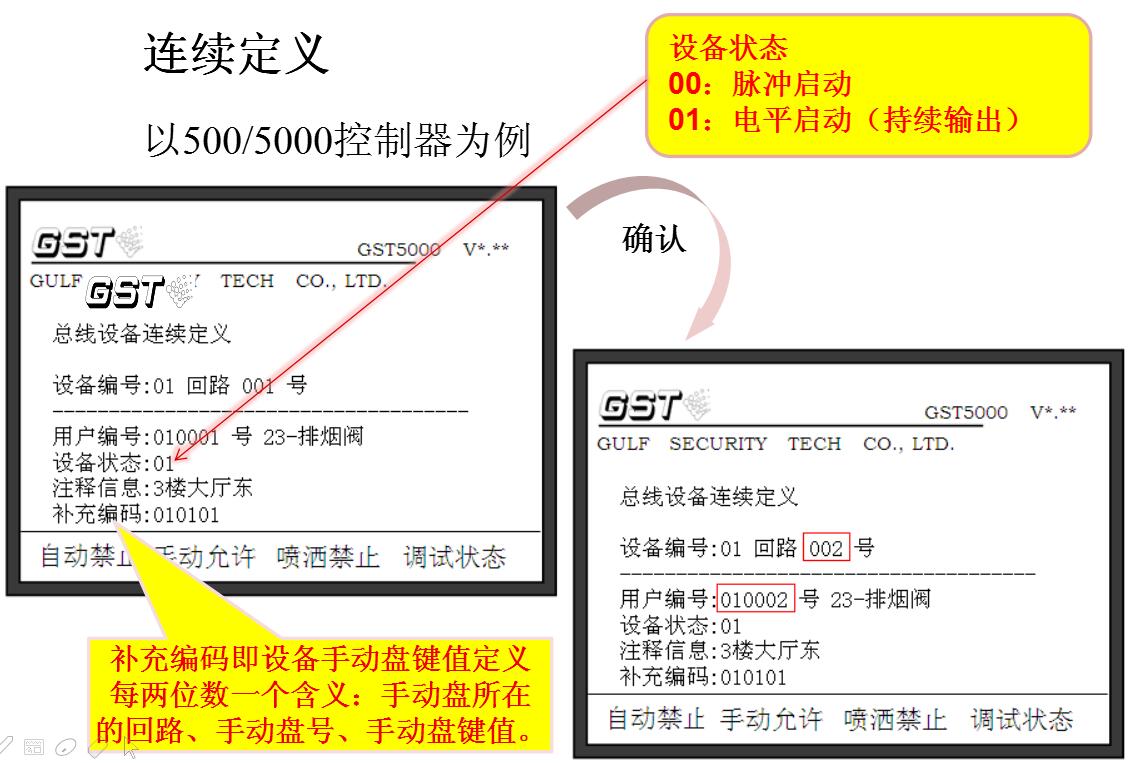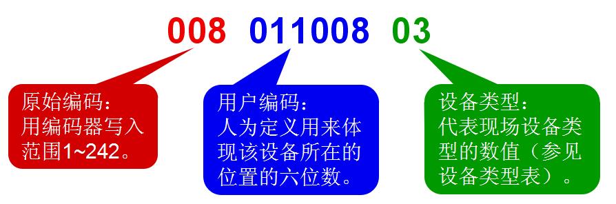 控制器所接的可編址外部設(shè)備均需進(jìn)行編碼設(shè)定,每個(gè)設(shè)備對應(yīng)一個(gè)原始編碼(一次碼,如下圖紅色數(shù)字)和一個(gè)用戶編碼(二次碼,如下圖藍(lán)色+綠色數(shù)字構(gòu)成完整的二次碼),設(shè)備定義就是對用戶編碼進(jìn)行設(shè)定。被定義的設(shè)備既可以是已經(jīng)注冊在控制器上的,也可以是未注冊在控制器上的。