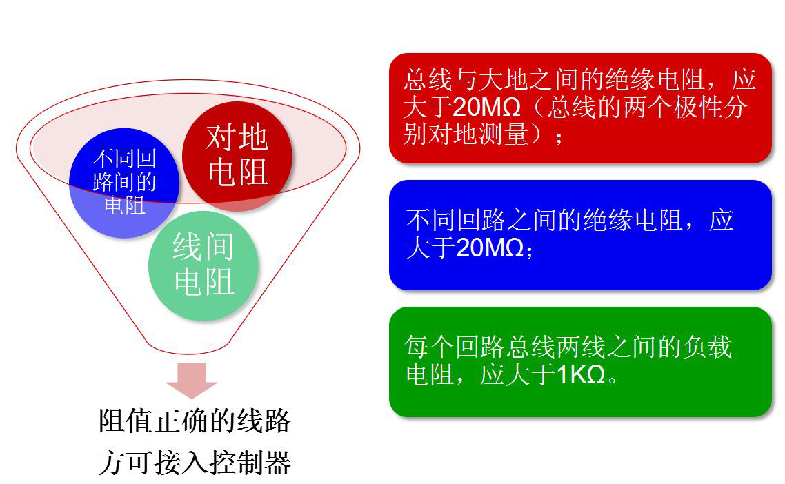 火災(zāi)自動報(bào)警系統(tǒng)導(dǎo)線敷設(shè)后,在安裝現(xiàn)場設(shè)備之前,應(yīng)對每回路的導(dǎo)線用500V的兆歐表(搖表)測量絕緣電阻,其對地絕緣電阻值不應(yīng)小于20MΩ。接好設(shè)備后,用萬用表的歐姆檔檢查線間是否短路,阻值是否正常(大于1KΩ),線路是否接地(大于20MΩ)。有以上故障應(yīng)及時(shí)處理。