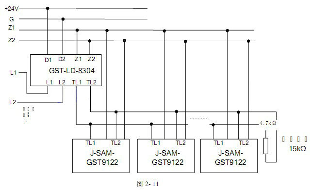 作為手動火災(zāi)報警按鈕使用時,將報警按鈕的Z1、Z2端子直接接入火災(zāi)報警控制器總線上即可。作為手動火災(zāi)報警按鈕及消防電話插孔使用時,將報警按鈕的Z1、Z2端子直接接入火災(zāi)報警控制器總線上,同時將報警按鈕的TL1、TL2端子與GST-LD-8304消防電話模塊連接,具體見圖2-11所示(最末端報警按鈕的TL1、TL2接線端子接4.7kΩ終端電阻)。