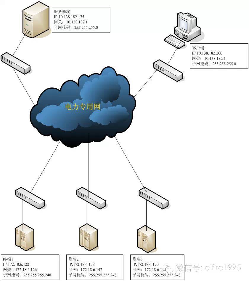 到達(dá)現(xiàn)場后,供電公司給出了如下圖所示的三個終端網(wǎng)絡(luò)參數(shù)、一個服務(wù)器端網(wǎng)絡(luò)參數(shù)、一個客戶端網(wǎng)絡(luò)參數(shù)(具體網(wǎng)絡(luò)結(jié)構(gòu)尚不清楚,初步簡化為下圖)。