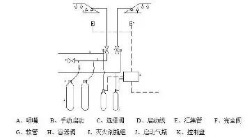 本系統(tǒng)的主要設(shè)備和器材包括:啟動(dòng)氣瓶、啟動(dòng)氣瓶、滅火劑瓶組、控制器、選擇閥、安全閥、容器閥、噴嘴等。