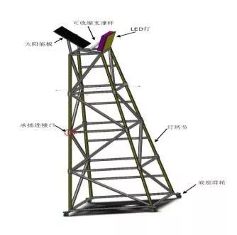 一種可移動(dòng)式太陽能施工照明燈,包括一個(gè)可移動(dòng)式燈塔架、太陽能蓄電池板及LED燈,每個(gè)燈塔架包括由一個(gè)可移動(dòng)底座、4到6個(gè)可組裝式燈塔節(jié),所述可組裝式燈塔節(jié)每個(gè)高1m,上下成椎體,最大燈塔節(jié)邊長(zhǎng)為1米,最小燈塔節(jié)邊長(zhǎng)為0.4米,可移動(dòng)式底座由4個(gè)萬向輪組成,每個(gè)萬向輪均設(shè)置鎖定裝置,移動(dòng)時(shí)將鎖定裝置解鎖方可移動(dòng)。