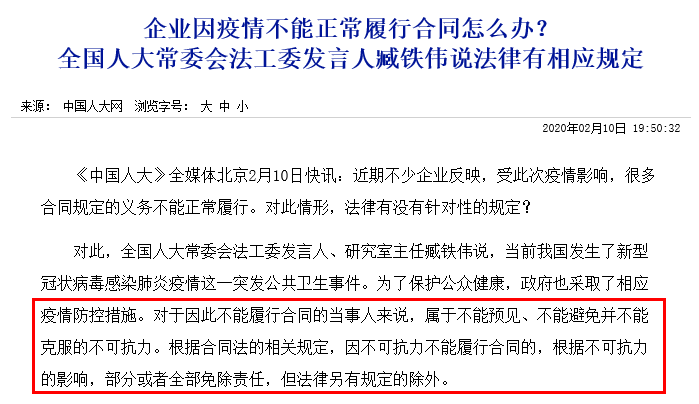 • 關(guān)鍵詞:全國(guó)人大法工委:新冠肺炎疫情屬于不可抗力!