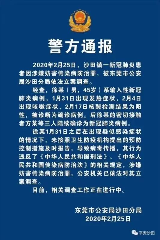 日前,東莞市沙田首例確診患者徐某,發(fā)病后未及時(shí)報(bào)告,導(dǎo)致與其密切接觸的方某等3人確診,涉嫌防害傳染病防治罪被立案調(diào)查。