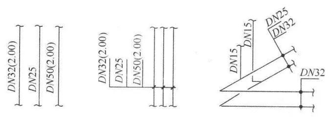 6、水平管道的規(guī)格宜標(biāo)注在管道的上方;豎向管道的規(guī)格宜標(biāo)注在管道的左側(cè)。雙線表示的管道,其規(guī)格可標(biāo)注在管道輪廓線內(nèi)。