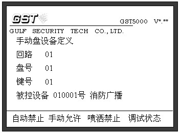 上圖中,“回路”代表手動(dòng)盤所在的回路號(hào);“盤號(hào)”代表欲進(jìn)行定義的手動(dòng)盤的盤號(hào),為01~04;“鍵號(hào)”為欲進(jìn)行定義的手動(dòng)盤的按鍵號(hào),為01~64。在圖5-14狀態(tài)下按“確認(rèn)”鍵后,在“被控設(shè)備”處顯示該手動(dòng)盤按鍵已經(jīng)定義設(shè)備的用戶編號(hào)及設(shè)備類型。
