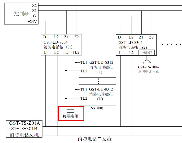 海灣GST-LD-8312消防電話(huà)插孔端子X(jué)T1電話(huà)線(xiàn)輸入端,端子X(jué)T2電話(huà)線(xiàn)輸出端,接下一個(gè)電話(huà)插孔,最末端電話(huà)插孔XT2接線(xiàn)端子接4.7kΩ終端電阻。