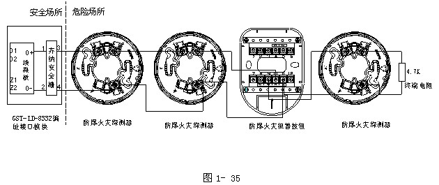 GST-LD-8332模塊箱可與防爆的感溫火災(zāi)探測(cè)器、感煙火災(zāi)探測(cè)器及手動(dòng)火災(zāi)報(bào)警按鈕一起接入火災(zāi)報(bào)警控制器系統(tǒng)中組成本安型防爆系統(tǒng)。在系統(tǒng)連線末端必須連接一4.7kΩ終端電阻,且一只編址接口模塊混接的各類(lèi)防爆探測(cè)器及報(bào)警探測(cè)不能超過(guò)10只。系統(tǒng)連線如圖1- 35所示。