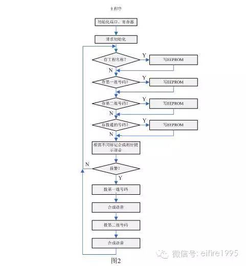 主程序主要完成初始化、存儲(chǔ)工程名稱及電話號(hào)碼、合成反映系統(tǒng)運(yùn)行狀態(tài)的提示語(yǔ)音、撥打預(yù)設(shè)的電話、合成報(bào)警語(yǔ)音等。其框圖如圖2所示。