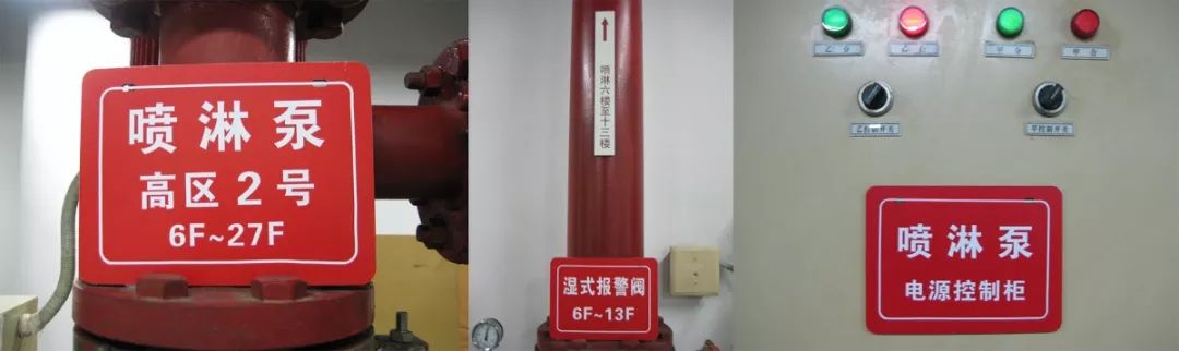 設(shè)置要求:水泵、報(bào)警閥、控制柜等標(biāo)牌應(yīng)為紅底白字,標(biāo)明編號(hào)、所管樓層范圍、水流方向等相關(guān)內(nèi)容。