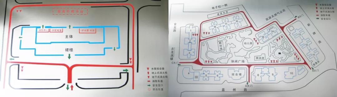 設(shè)置要求:在建筑大門口左側(cè)或住宅小區(qū)(廠區(qū)、庫(kù)區(qū))主入口處的醒目位置應(yīng)設(shè)置XX建筑消防總平面布局圖。主要包括建筑(住宅小區(qū)、廠區(qū)、庫(kù)區(qū)等)總平面布局圖、消防車道、撲救面、室外消火栓、水泵結(jié)合器、消防控制室位置、建筑通向室外的主要出口、以及住宅小區(qū)(廠區(qū)、庫(kù)區(qū)等)通向外部的出入口等內(nèi)容。