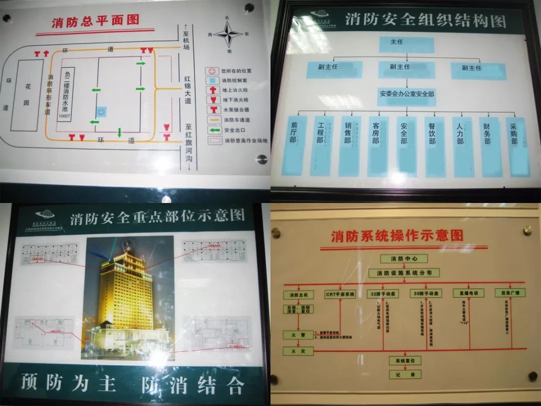 建筑消防總平面布局圖、消防安全組織機(jī)構(gòu)圖、消防系統(tǒng)操作流程示意圖、消防安全重點(diǎn)部位示意圖。