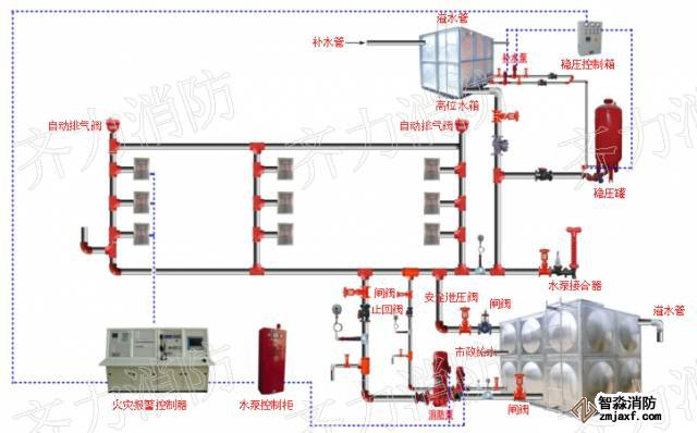 自動噴水滅火系統(tǒng)分為濕式、干式和預(yù)作用式等類型。目前,大部分高層建筑使用的為濕式系統(tǒng),即平時(shí)在管道中充有一定壓力的水,當(dāng)保護(hù)對象發(fā)生火災(zāi)時(shí),噴頭周圍溫度升高,達(dá)到一定溫度時(shí),含金片熔化,噴頭碎裂,水從噴口向四周均勻噴灑,進(jìn)行滅火。其組成是由報(bào)警閥、延遲器、水力警鈴、管網(wǎng)、噴頭。