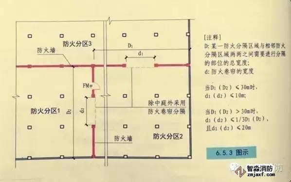 1.除中庭外,當(dāng)防火分隔部位的寬度不大于30m時(shí),防火卷簾的寬度不應(yīng)大于10m;當(dāng)防火分隔部位的寬度大于30ml時(shí),防火卷簾的寬度不應(yīng)大于該部位寬度的1/3,且不應(yīng)大于20m?!緢D示】