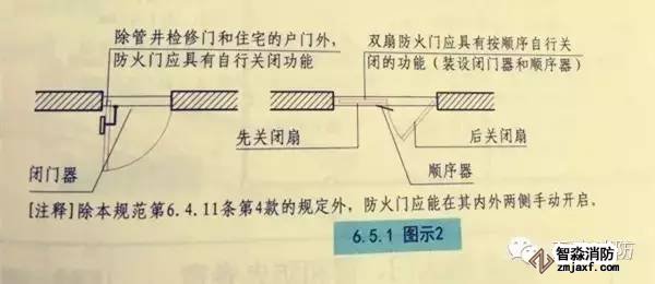 3.除管井檢修門(mén)和住宅的戶(hù)門(mén)外,防火門(mén)應(yīng)具有自行關(guān)閉功能。雙扇防火門(mén)應(yīng)具有按順序自行關(guān)閉的功能?!緢D示2