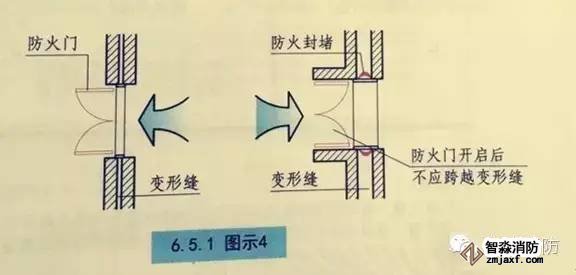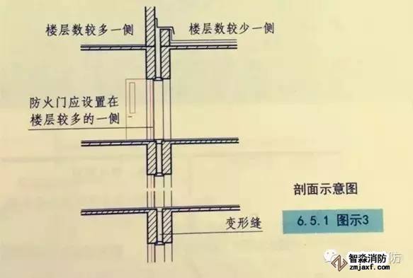 5.設(shè)置在建筑變形縫附件時(shí),防火門(mén)應(yīng)設(shè)置在樓層較多的一側(cè)【圖示3】,并應(yīng)保證防火門(mén)開(kāi)啟時(shí)門(mén)扇不跨越變形縫?!緢D示4