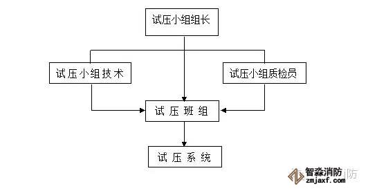 試壓時成立專門的試壓小組,試壓小組設(shè)組長一人,試壓時聽從組長指揮,試壓組織方塊圖如下: