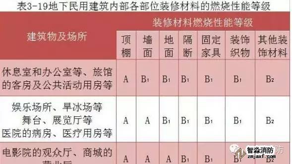 2.地下民用建筑內(nèi)部各部位裝修材料的燃燒性能等級,不應(yīng)低于表3-19的規(guī)定。