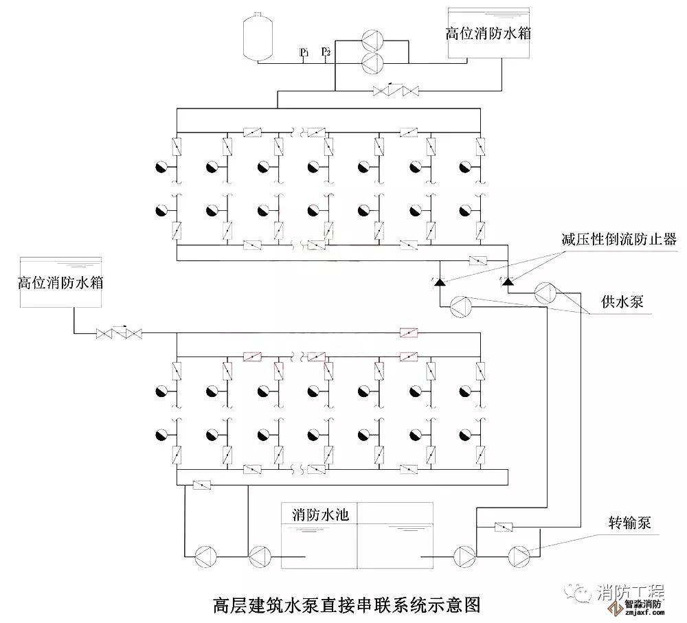 2)串聯(lián)轉(zhuǎn)輸水箱的溢流管宜連接到消防水池。