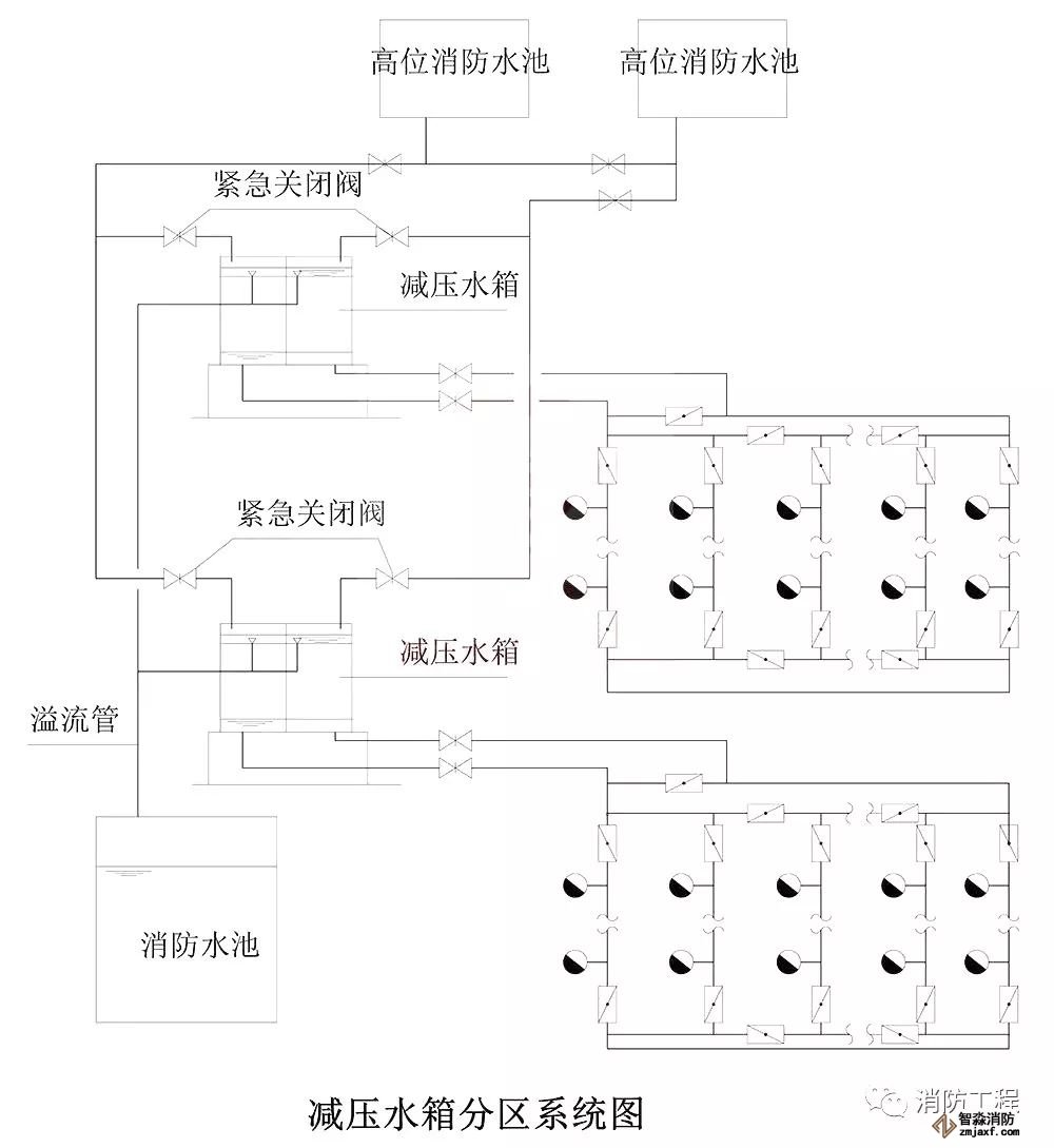 4)減壓水箱應有兩條進、出水管,且每條進、出水管應滿足消防給水系統(tǒng)所需消防用水量的要求。
