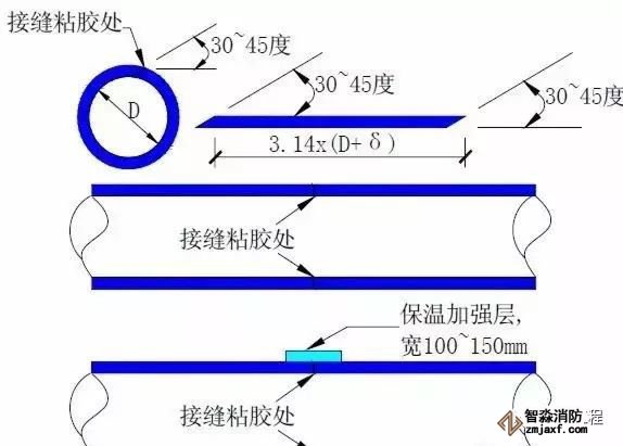 1、將順著管道方向保溫板接口由原來(lái)的900改為,采用300~450裁口粘膠連接,從而提高粘膠接觸面1.4~2倍。