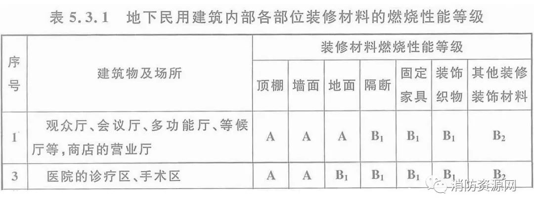 三、地下建筑中的醫(yī)院診療區(qū)、手術(shù)區(qū),內(nèi)部各部位裝修材料的燃燒性能等級,不應(yīng)低于《建筑內(nèi)部裝修設(shè)計防火規(guī)范》表5.3.1的規(guī)定。