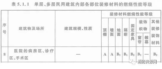 一、單層、多層醫(yī)院建筑的病房區(qū)、診療區(qū)、手術(shù)區(qū),內(nèi)部各部位裝修材料的燃燒性能等級,不應(yīng)低于《建筑內(nèi)部裝修設(shè)計防火規(guī)范》表5.1.1的規(guī)定。