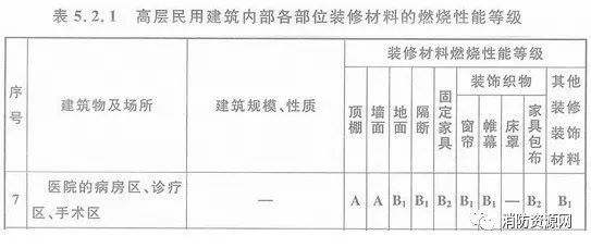 二、高層醫(yī)院建筑的病房區(qū)、診療區(qū)、手術(shù)區(qū),內(nèi)部各部位裝修材料的燃燒性能等級,不應(yīng)低于《建筑內(nèi)部裝修設(shè)計防火規(guī)范》表5.2.1的規(guī)定。
