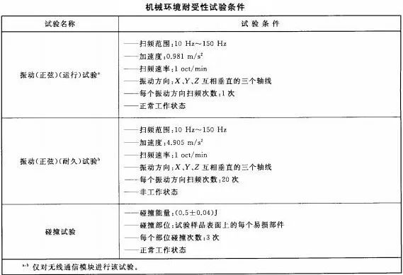 系統(tǒng)應(yīng)能耐受下表所規(guī)定的機械條件下的各項試驗。試驗期間,系統(tǒng)應(yīng)無機械損傷和緊固部位松動現(xiàn)象;試驗后,系統(tǒng)應(yīng)保持正常無線通信狀態(tài)。
