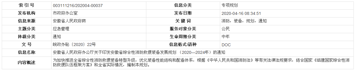 安徽省人民政府辦公廳關(guān)于印發(fā)安徽省綜合性消防救援裝備發(fā)展規(guī)劃(2020—2024年)的通知