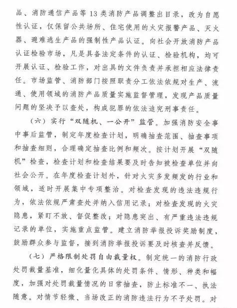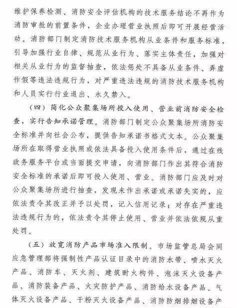 在簡政放權方面,取消和精簡3項消防審批。一是取消消防技術服務機構(gòu)資質(zhì)許可,取消消防設施維護保養(yǎng)檢測、消防安全評估機構(gòu)資質(zhì)許可制度,企業(yè)辦理營業(yè)執(zhí)照后即可開展經(jīng)營活動。二是簡化公眾聚集場所投入使用、營業(yè)前消防安全檢查,實行告知承諾管理,公眾聚集場所作出其符合消防安全標準的承諾后即可投入使用、營業(yè)。三是放寬消防產(chǎn)品市場準入限制,將強制性產(chǎn)品認證目錄中的13類消防產(chǎn)品調(diào)整出目錄,改為自愿性認證,僅保留公共場所、住宅使用的火災報警產(chǎn)品、滅火器、避難逃生產(chǎn)品的強制性產(chǎn)品認證;向社會開放消防產(chǎn)品認證、檢驗市場,凡是具備法定條件的認證、檢驗機構(gòu),均可開展認證、檢驗工作。消防部門制定消防技術服務機構(gòu)從業(yè)條件和服務標準、公眾聚集場所消防安全標準,引導加強行業(yè)自律、規(guī)范從業(yè)行為,加強監(jiān)督抽查,依法懲處違法違規(guī)行為,對嚴重違法違規(guī)的實行行業(yè)退出、永久禁入或者責令停止使用、營業(yè)。