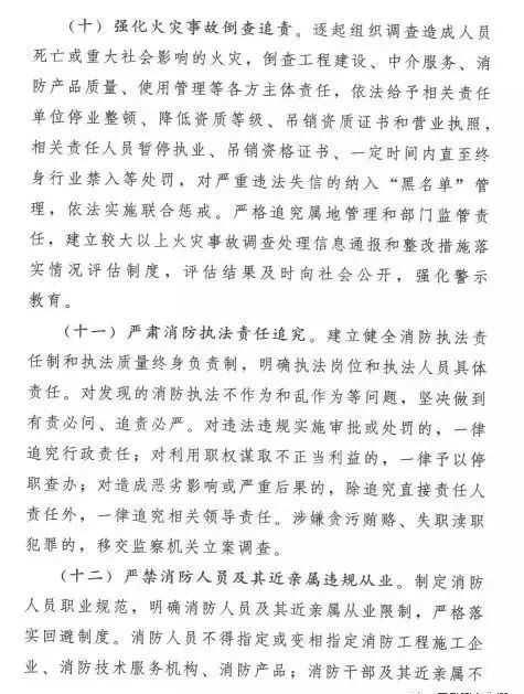 在加強事中事后監(jiān)管方面,實行“雙隨機、一公開”監(jiān)管,明確抽查范圍、抽查事項和抽查細則,合理確定抽查比例和頻次;針對火災多發(fā)頻發(fā)的行業(yè)和領域,適時開展集中專項整治,對隱患突出、有嚴重違法違規(guī)記錄的單位,實施重點監(jiān)管;建立消防舉報投訴獎勵制度,鼓勵群眾參與監(jiān)督;將消防違法違規(guī)行為記入信用記錄,嚴重違法失信企業(yè)納入“黑名單”管理,依法實施聯(lián)合懲戒;完善“互聯(lián)網(wǎng)+監(jiān)管”,運用物聯(lián)網(wǎng)和大數(shù)據(jù)技術,實時化、智能化評估消防安全風險,實現(xiàn)精準監(jiān)管;強化火災事故倒查追責,逐起組織調(diào)查造成人員死亡或造成重大社會影響的火災,倒查工程建設、中介服務、消防產(chǎn)品質(zhì)量、使用管理等各方主體責任,嚴肅責任追究。