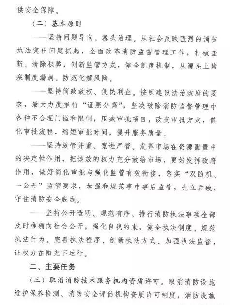《意見》明確,消防執(zhí)法改革要堅持問題導向、源頭治理,從社會反映強烈的消防執(zhí)法突出問題抓起,全面改革消防監(jiān)督管理工作,從源頭上堵塞制度漏洞、防范化解風險;堅持簡政放權、便民利企,最大力度推行“證照分離”,堅決破除消防監(jiān)督管理中各種不合理門檻和限制,提升服務質(zhì)量;堅持放管并重、寬進嚴管,把該放的權力充分放給市場,做好簡化審批和強化監(jiān)管有效銜接,加強和規(guī)范事中事后監(jiān)管,守住消防安全底線;堅持公開透明、規(guī)范有序,健全執(zhí)法制度、規(guī)范執(zhí)法行為、完善執(zhí)法程序、創(chuàng)新執(zhí)法方式、加強執(zhí)法監(jiān)督,讓權力在陽光下運行。同時,提出了消防執(zhí)法改革5個方面12項主要任務。