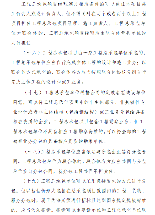8、工程總承包項(xiàng)目經(jīng)理滿足相應(yīng)條件的可以兼任本項(xiàng)目施工負(fù)責(zé)人或設(shè)計(jì)負(fù)責(zé)人,但不得同時(shí)在兩個(gè)或者兩個(gè)以上工程項(xiàng)目擔(dān)任工程總承包項(xiàng)目經(jīng)理、施工負(fù)責(zé)人。工程總承包單位為聯(lián)合體的,工程總承包項(xiàng)目經(jīng)理應(yīng)由聯(lián)合體牽頭單位的人員擔(dān)任。