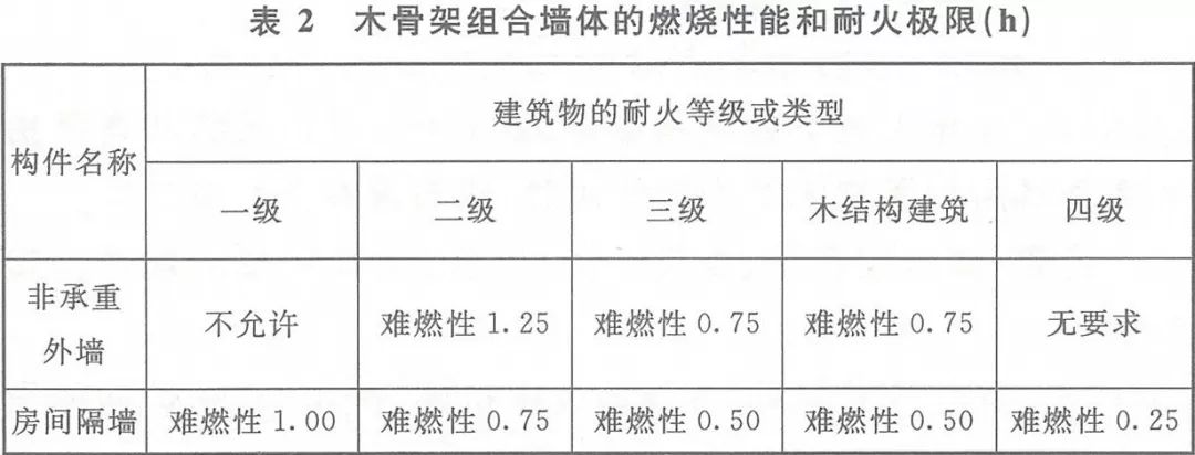 (3)木骨架組合墻體的燃燒性能和耐火極限應(yīng)符合下表2的規(guī)定,其他要求應(yīng)符合現(xiàn)行國(guó)家標(biāo)準(zhǔn)《木骨架組合墻體技術(shù)規(guī)范》GB/T 50361的規(guī)定。