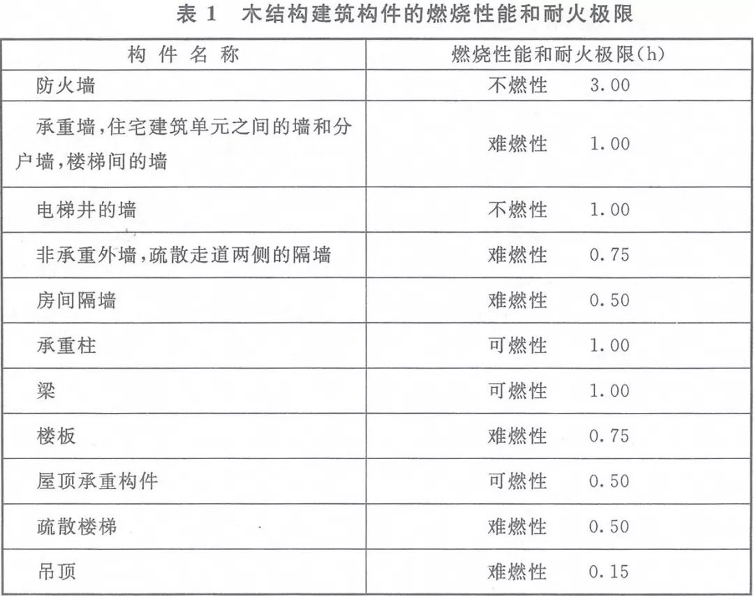 1、木結(jié)構(gòu)建筑的防火設(shè)計(jì)可按本文的規(guī)定執(zhí)行。建筑構(gòu)件的燃燒性能和耐火極限應(yīng)符合下表1的規(guī)定。