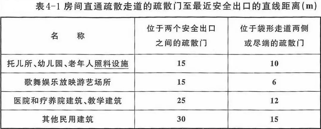 (2)房間直通疏散走道的疏散門(mén)至最近安全出口的直線距離不應(yīng)大于下表4-1的規(guī)定;