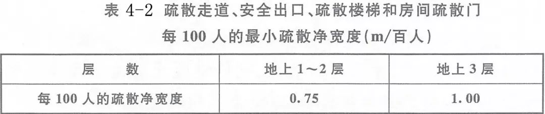 (4)建筑內(nèi)疏散走道、安全出口、疏散樓梯和房間疏散門(mén)的凈寬度,應(yīng)根據(jù)疏散人數(shù)按每100人的最小疏散凈寬度不小于下表4-2的規(guī)定計(jì)算確定;