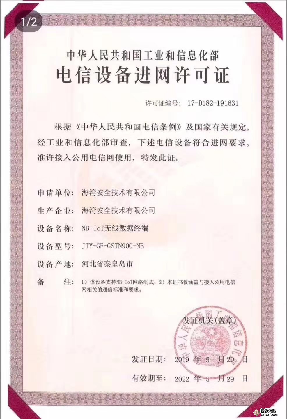 海灣NB煙感是國(guó)內(nèi)唯一可提供工信部入網(wǎng)許可證的廠家