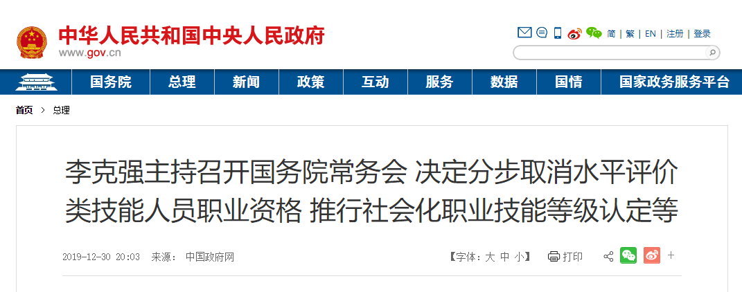 國務(wù)院總理李克強12月30日主持召開國務(wù)院常務(wù)會議,決定分步取消水平評價類技能人員職業(yè)資格,推行社會化職業(yè)技能等級認(rèn)定。