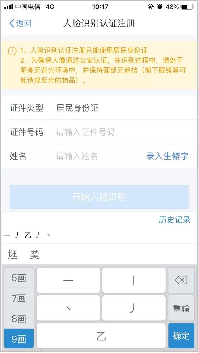 4.如實填寫身份相關(guān)信息,包括:證件類型、證件號碼、姓名,點擊【開始人臉識別】。若姓名中存在生僻字,可點擊【錄入生僻字】通過筆畫輸入法錄入;