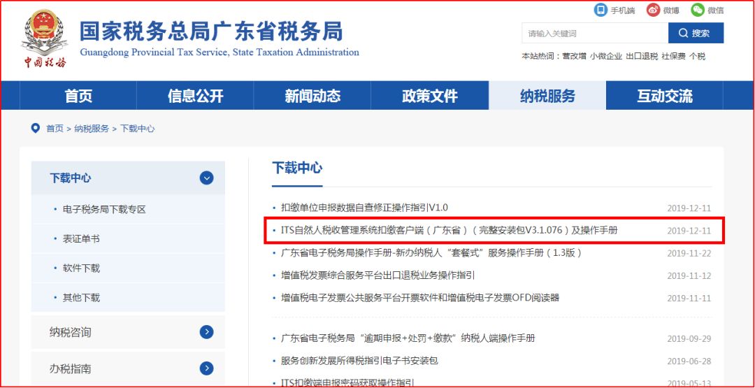訪問廣東省稅務(wù)局門戶網(wǎng)站首頁,依次點擊“納稅服務(wù) > 下載中心 > ITS自然人稅收管理系統(tǒng)扣繳客戶端(廣東?。ㄍ暾惭b包V3.1.076)及操作手冊”,如下圖: