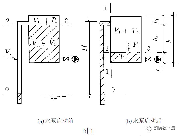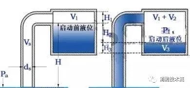 水泵啟動前,真空引水罐內(nèi)的水應(yīng)灌至真空引水罐能做到的大存水量,此時罐內(nèi)部由水+空氣兩部分構(gòu)成,液面上方的氣體容積為V1。罐內(nèi)外的壓力與大氣壓力Pa相同。