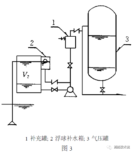 如圖三所示, 當(dāng)補氣罐及水泵出水管上止回閥以前的管道水容積較小時(小于真空罐容積V2時)停泵后,在補氣罐補氣過程中,外界空氣有可能進入真空罐,破壞了真空度,待下次啟泵時不出水。這種情況在實際工程中曾發(fā)生過,后將補氣罐容積加大而解決。解決方法可適當(dāng)加大補氣罐容積或增加一個浮球式補水箱。