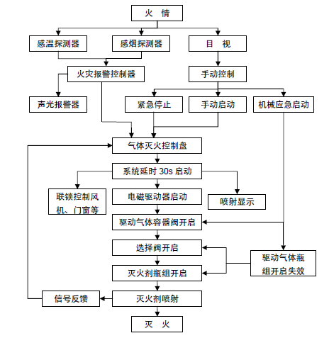 當(dāng)火災(zāi)探測(cè)器感溫探測(cè)器、感煙探測(cè)器)探測(cè)到火情后,將火災(zāi)信號(hào)反饋到火災(zāi)報(bào)警控制器,火災(zāi)報(bào)警控制器控制聲光報(bào)警器,發(fā)出撤離報(bào)警信號(hào)。同時(shí),火災(zāi)報(bào)警控制器將信號(hào)傳遞給氣體滅火控制盤(pán),由氣體滅火控制盤(pán)控制聯(lián)動(dòng)設(shè)備,30 秒延時(shí)后,向電磁驅(qū)動(dòng)器發(fā)出啟動(dòng)信號(hào)(DC24V,1.5A),電磁驅(qū)動(dòng)器開(kāi)啟驅(qū)動(dòng)氣體容器閥,驅(qū)動(dòng)氣體順序開(kāi)啟選擇閥、滅火劑瓶組容器閥,釋放滅火劑,滅火劑通過(guò)噴嘴噴放到保護(hù)區(qū)中,達(dá)到滅火目的。當(dāng)滅火劑流經(jīng)系統(tǒng)管路時(shí),信號(hào)反饋裝置動(dòng)作,電信號(hào)反饋到氣體滅火控制盤(pán),表明滅火劑已噴放。