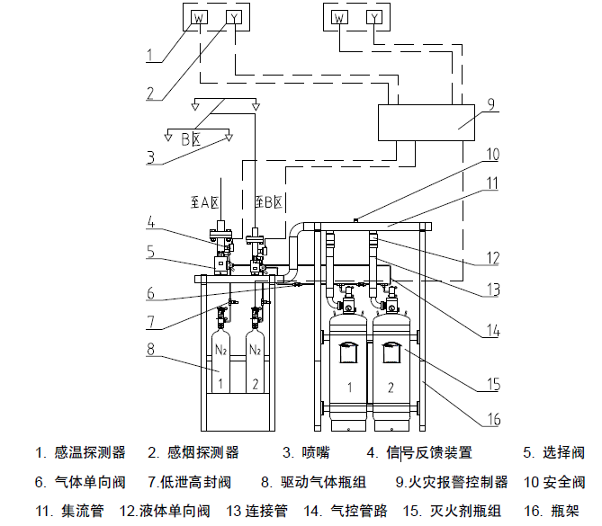 系統(tǒng)由滅火劑瓶組、驅(qū)動(dòng)氣體瓶組、選擇閥、液體單向閥、連接管、集流管、安全閥、信號(hào)反饋裝置、氣體單向閥、低泄高封閥、噴嘴、氣控管路、瓶架、驅(qū)動(dòng)氣體瓶架等組成。