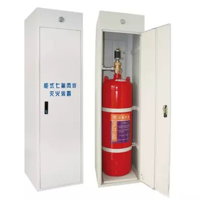 柜式七氟丙烷滅火裝置是將七氟丙烷滅火劑瓶組和噴嘴等部件與立柜預(yù)先組合成套的滅火裝置。柜式七氟丙烷滅火裝置不用設(shè)置消防儲(chǔ)瓶間,滅火裝置直接置于防護(hù)區(qū)內(nèi)。本滅火裝置輕便可移動(dòng),安裝簡便、靈活,不需要安裝管網(wǎng),無滅火劑管路損失。當(dāng)發(fā)生火災(zāi)時(shí),本裝置直接向防護(hù)區(qū)噴放滅火劑,滅火效率高,速度快。
