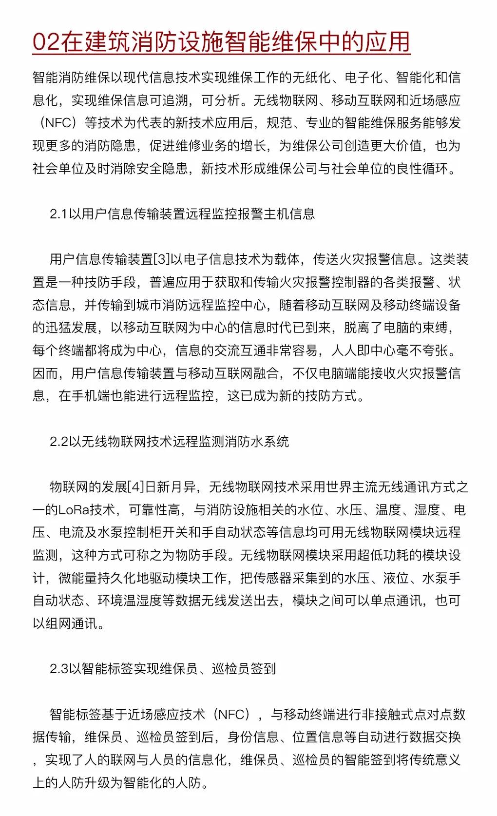 建筑消防設施智能維保管理系統(tǒng)采用無線物聯(lián)網(wǎng)、互聯(lián)網(wǎng)、近場感應等技術(shù),節(jié)省了大量的施工布線成本,改變了傳統(tǒng)消防設施維護保養(yǎng)方式,滿足了社會單位、維保公司和消防主管部門的消防設施管理檢查的需求,符合消防事業(yè)的規(guī)劃與發(fā)展潮流,是社會單位消防安全管理向消防信息化、智能化轉(zhuǎn)變的模式創(chuàng)新。