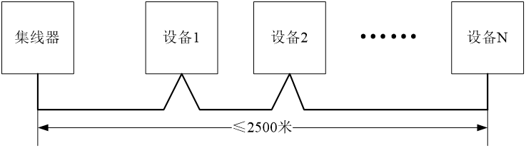 布線方式建議采用手拉手方式,可采用T形布線,N≤109。其中集線器與設(shè)備N需要配置匹配電阻,其他設(shè)備不配置匹配電阻。