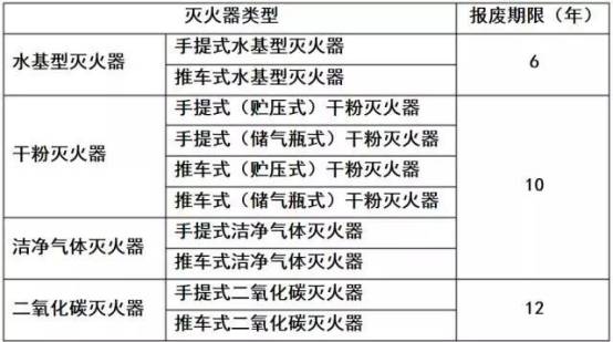 4.3 滅火器出廠時間達到或超過下表規(guī)定的報廢期限時應報廢。